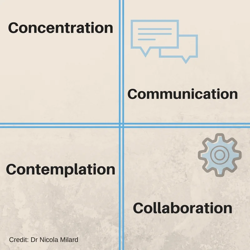 It’s going to take me a bit of time to put the episode together, so while I do that, I’d like to share what I picked up as the main trend in the UK corporate world, as well as a handy framework I came across that might help you structure your communications or decide where your team might work from best.